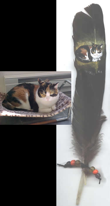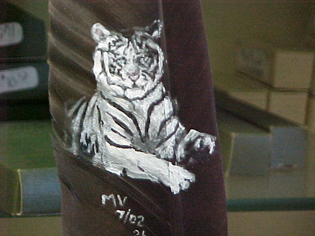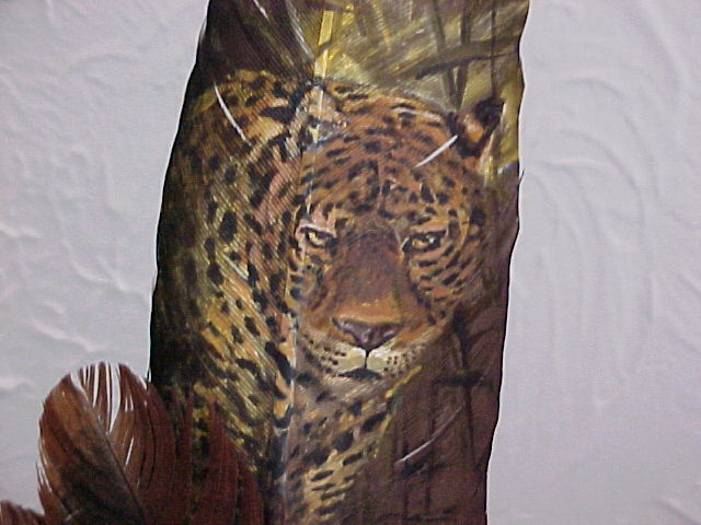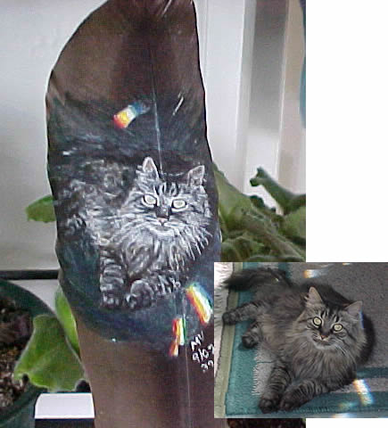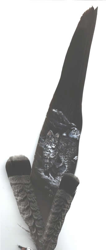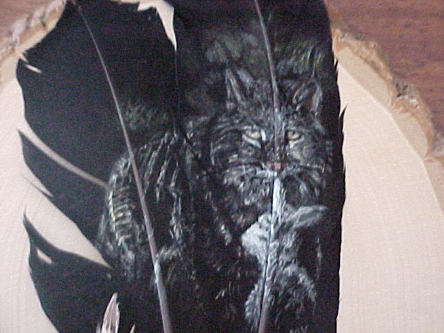 Cats h17b-6/05I painted this beautiful cat on a deer hide to say thanks to a friend who rescues cats. h17a-6/05 close-up of black jaguar f67a-12/02Monty, my cat on feather f68a-12/02Fred, my cat on feather f66a-12/02Ember, my cat on feather f65a-12/02Bobcat on feather f39a-9/02Henri, my cat on feather f27a-7/02Jaguar Hunting on feather f26a-7/02White Tiger on feather f17a-6/02Cougar on feather f5a-5/02Bobcat with Rabbit on multiple feathers, mounted on wood Share this: Click to share on X (Opens in new window) X Click to share on Facebook (Opens in new window) Facebook Click to share on Pinterest (Opens in new window) Pinterest Like Loading... Related