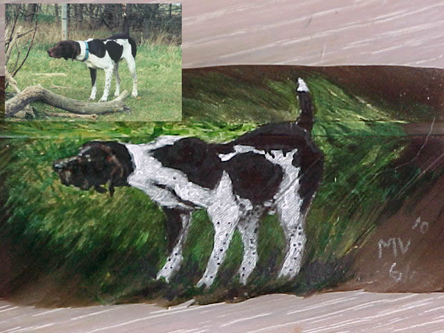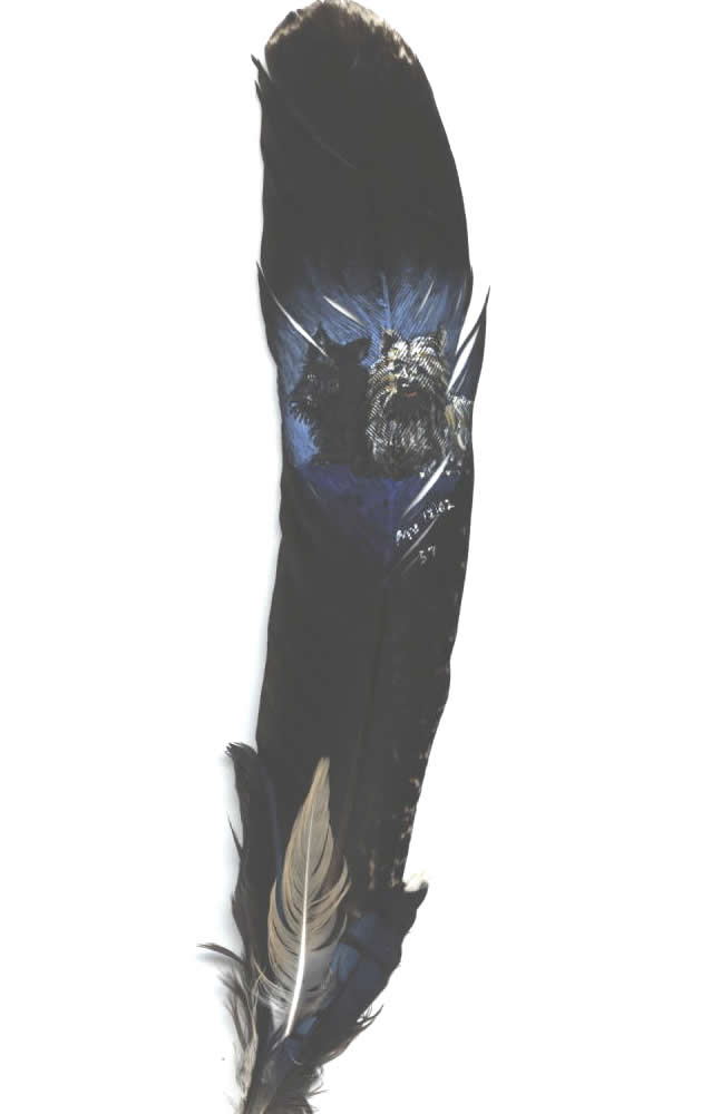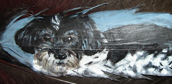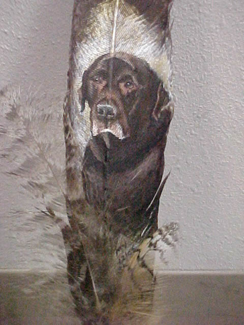 Dogs f171 – 7/16 Denver, a great soul, painted on a feather f172 – 2/17 Darla, black lab painted on a feather h21a-12/12Bailey-white German Shepherd on deer hide h9a-12/03Scooter (in memorium) h8b-111/03Blue heeler dog painted on deer hide h8a-11/03Close-up of Blue heeler painted on deer hide, with photo of the dog f71a-02/03Billy, dog with photo on feather f57a-12/02Scottie & Cairn dogs on feather f54a-12/02Labrador dog on feather f20a-7/02Oscar & Otis on feather with photo f10a-6/02German Shorthair Pointer on feather with photo f120a-11/08Mickey, dog on feather Share this: Click to share on X (Opens in new window) X Click to share on Facebook (Opens in new window) Facebook Click to share on Pinterest (Opens in new window) Pinterest Like Loading... Related