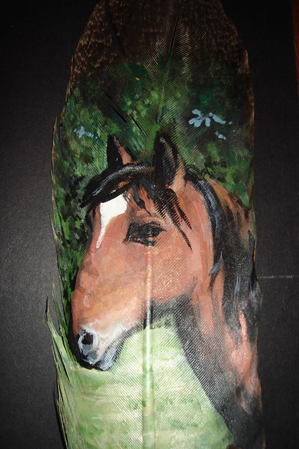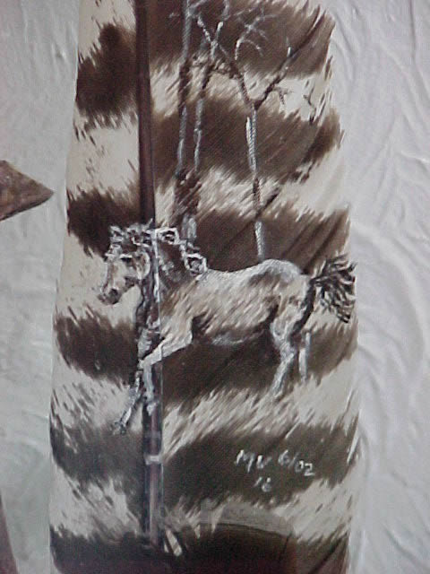 Horses h15b-12/04Deer hide painting of a paint horse running in the mist, showing full hide h15a-12/04Close-up deer hide painting of a paint horse running in the mist f111a – 9/07Horse head on feather f78a-8/03Horse painted on feather, with photo f70a-1/03Paint horse w/Native American painted on feather f44a-9/02Paint Horse on feather, with photo f18a-6/02Buckskin horse on feather, with photo f16a-6/02Horse on Stripes on feather f13a-6/02Running Horse on feather f11a-6/02Rearing Horse on feather mounted on wood f8a-6/02Horse & Native American on feather f128a-4/09Horse head on feather f133a-Buckskin Horse painted on feather, with photo Share this: Click to share on X (Opens in new window) X Click to share on Facebook (Opens in new window) Facebook Click to share on Pinterest (Opens in new window) Pinterest Like Loading... Related
